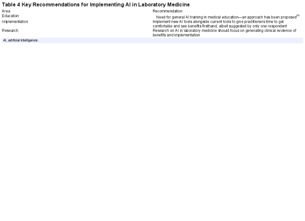Although it was not mentioned in the survey itself, an interesting strategy to implement AI in laboratory medicine was discussed in one of the group chats that was used to shape the final survey. One of the participants disclosed that in their hospital, a new AI tool was introduced alongside an existing tool that was used in routine clinical practice. The old tool was still used but as a backup for when the AI tool failed. Practitioners were encouraged to try the AI tool but could choose either of the available options. They gradually got familiar with the AI tool and could see the added value firsthand. They ended up switching to the AI tool completely. This illustrates a viable way to integrate AI tools in health care. Although more expensive, this provides an opportunity to compare these tools in practice and allow the practitioners to feel comfortable with the tool before having to rely on it completely. See Table 4 for our key recommendations.
