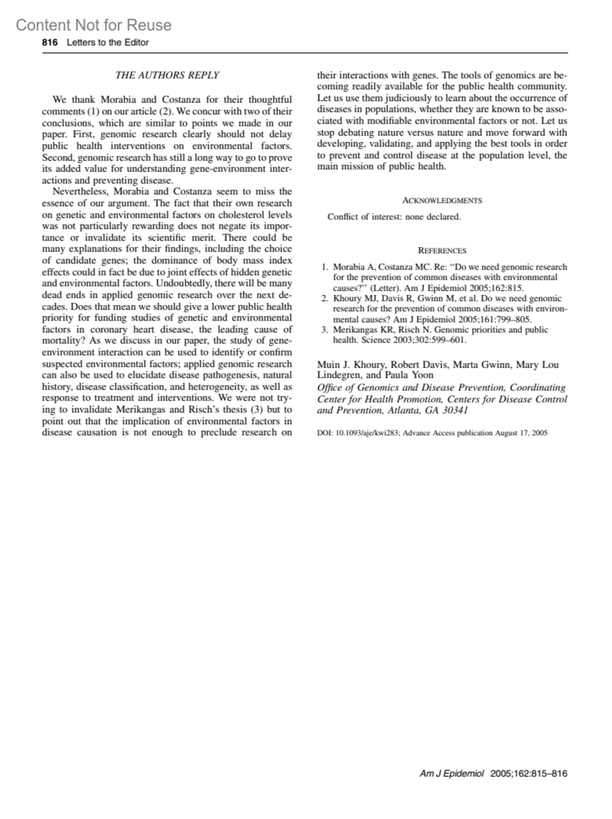 RE: “DO WE NEED GENOMIC RESEARCH FOR THE PREVENTION OF COMMON DISEASES WITH ENVIRONMENTAL CAUSES?”