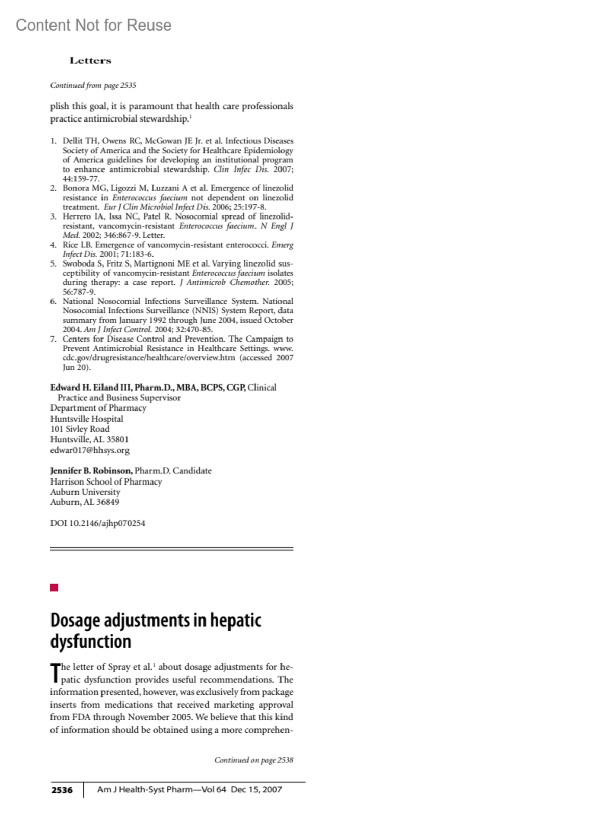 The Letters column includes the following types of contributions: (1) comments, addenda, and minor updates on previously published work, (2) alerts on potential problems in practice, (3) observations or comments on trends in drug use, (4) opinions on apparent trends or controversies in drug therapy or clinical research, (5) opinions on public health issues of interest to pharmacists in health systems, (6) comments on ASHP activities, and (7) human interest items about life as a pharmacist. Reports of adverse drug reactions must present a reasonably clear description of causality.