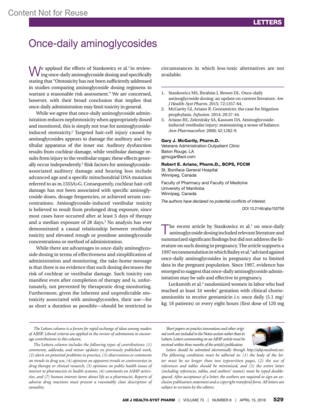 The Letters column includes the following types of contributions: (1) comments, addenda, and minor updates on previously published work, (2) alerts on potential problems in practice, (3) observations or comments on trends in drug use, (4) opinions on apparent trends or controversies in drug therapy or clinical research, (5) opinions on public health issues of interest to pharmacists in health systems, (6) comments on ASHP activities, and (7) human interest items about life as a pharmacist. Reports of adverse drug reactions must present a reasonably clear description of causality.
