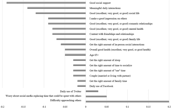 The factors with strongest magnitude associations with greater loneliness in the multivariable model were social anxiety/difficulty approaching others (sβ = +0.20) and expressing worry about social media replacing time that could be spent with others (sβ = +0.05), followed by daily use of Twitter, a text-based social media platform (sβ = +0.03). Figure 1 displays the relative magnitude of each significantly associated variable in order of effect.