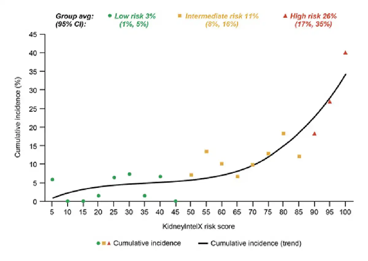 Cumulative incidence of the composite kidney outcome by continuous KidneyIntelX risk scores. CI, confidence interval.