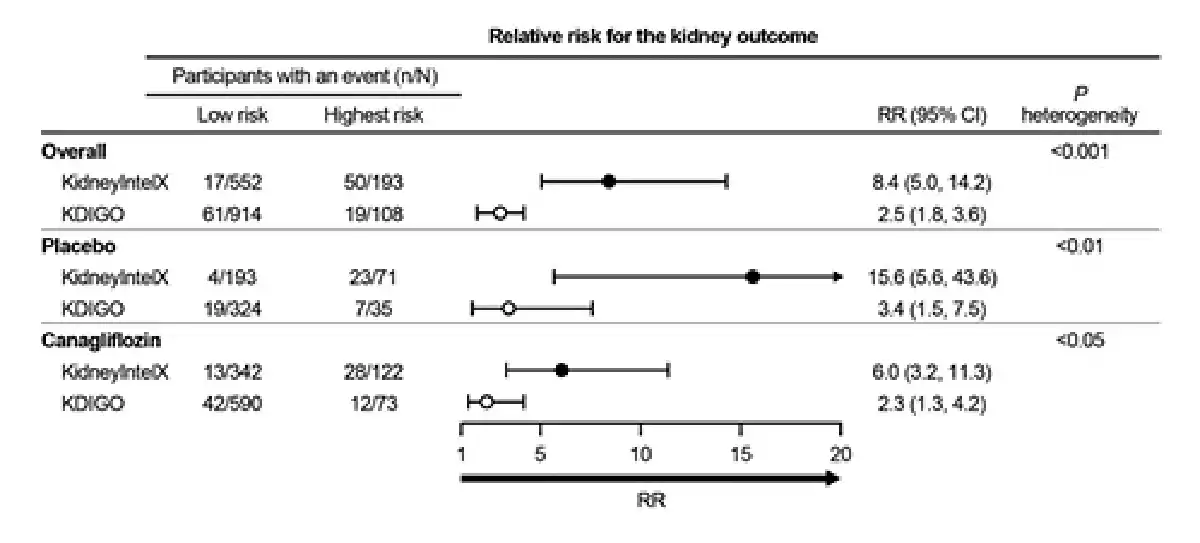 Absolute and RR for kidney outcomes by KidneyIntelX versus KDIGO. p value test for heterogeneity between the RR for KidneyIntelX versus KDIGO by the overall population and placebo and canagliflozin arms individually. RR, relative risk; CI, confidence interval; KDIGO, Kidney Disease Improving Global Outcomes.