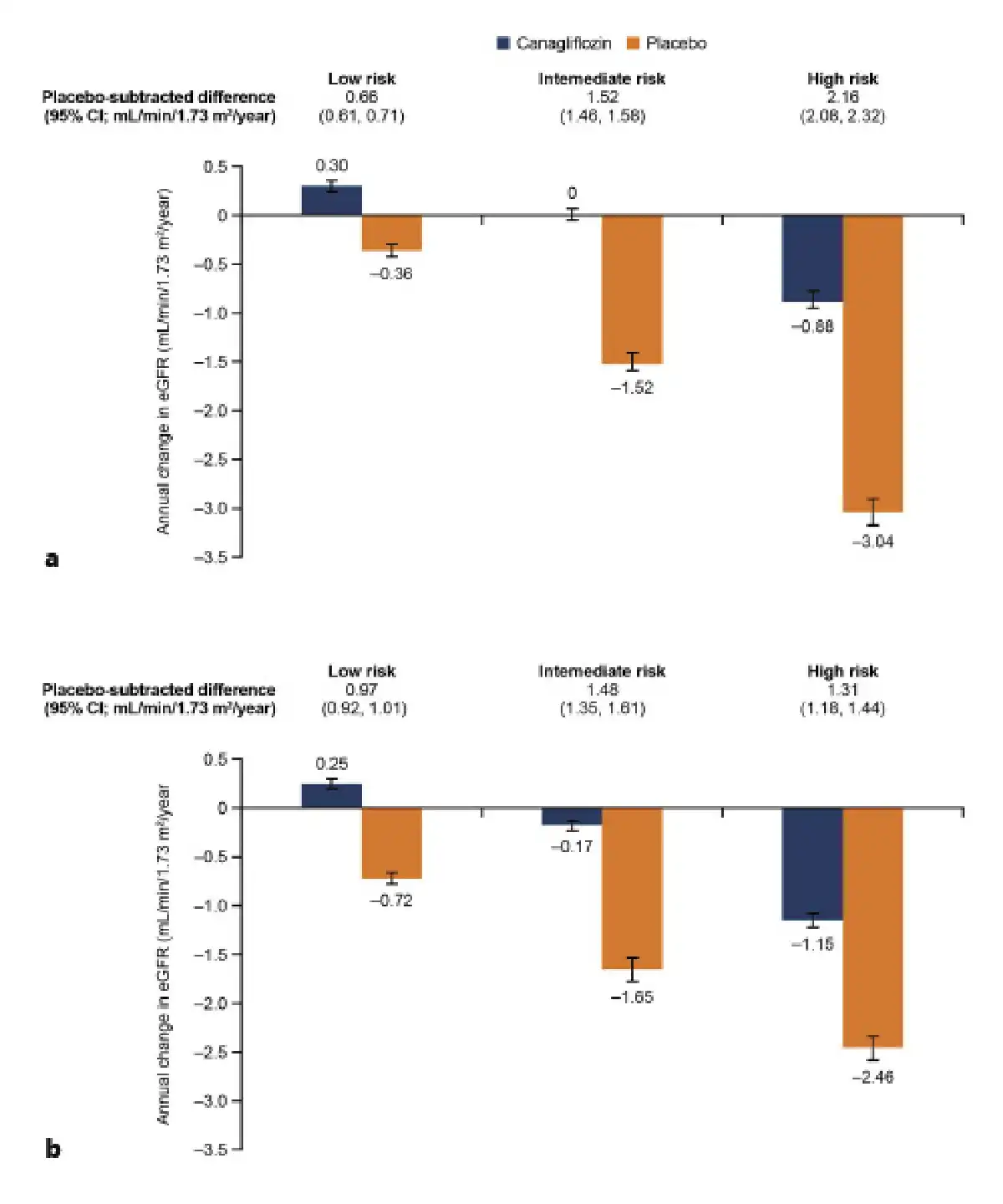 Absolute effect of canagliflozin versus placebo on the eGFR slope by KidneyIntelX (a) and KDIGO risk strata (b). eGFR, estimated glomerular filtration rate; CI, confidence interval; KDIGO, Kidney Disease Improving Global Outcomes.