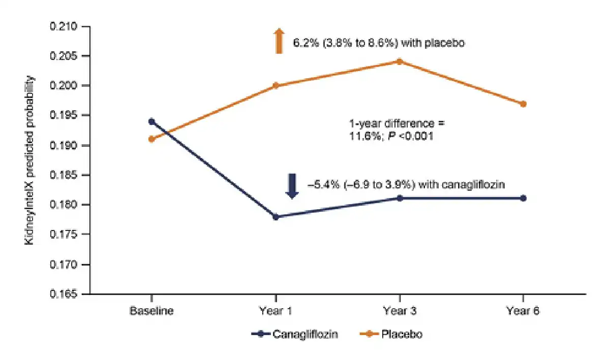Changes in KidneyIntelX over time in canagliflozin versus placebo-treated participants.