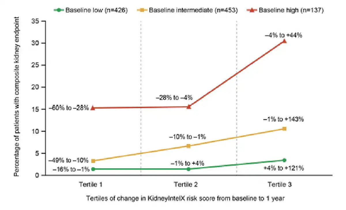 Change in KidneyIntelX and risk for composite kidney outcome. Tertiles of changes in KidneyIntelX risk scores from baseline to the follow-up, stratified by baseline KidneyIntelX risk stratum. Range of percent changes is shown for each stratum in each tertile.