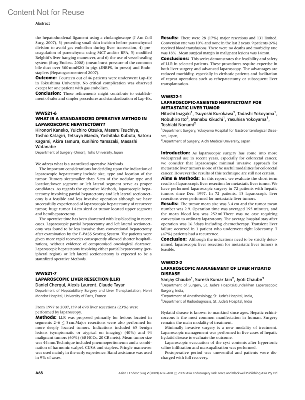 LAPAROSCOPIC MANAGEMENT OF LIVER HYDATID DISEASEWWS22-2Chaube, SanjayJain, Suresh KumarChaube, JyotiAuthor information1Department of Surgery, St. Jude's Hospital/Bundelkhan Laparoscopic Surgery, India,2Department of Anesthesiology, St. Jude's Hospital, India,3Department of Radiodiagnosis, St. Jude's Hospital, IndiaAsian Journal Of Endoscopic Surgery 2(2):p A68-A69, August 2009.Copyright © 2009 John Wiley & Sons, Inc.