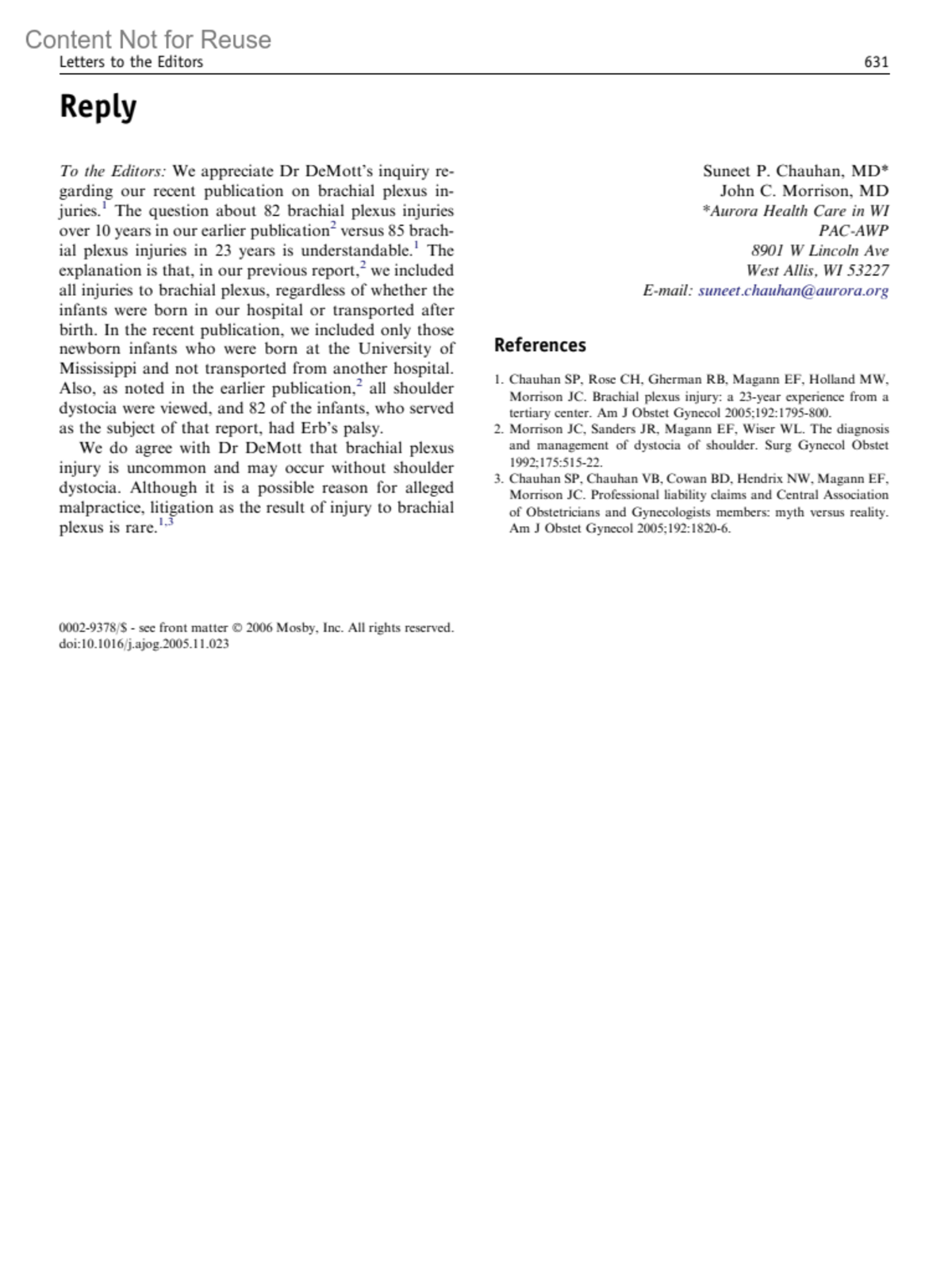 American Journal of Obstetrics and Gynecology 195(2):p 631, August 2006.