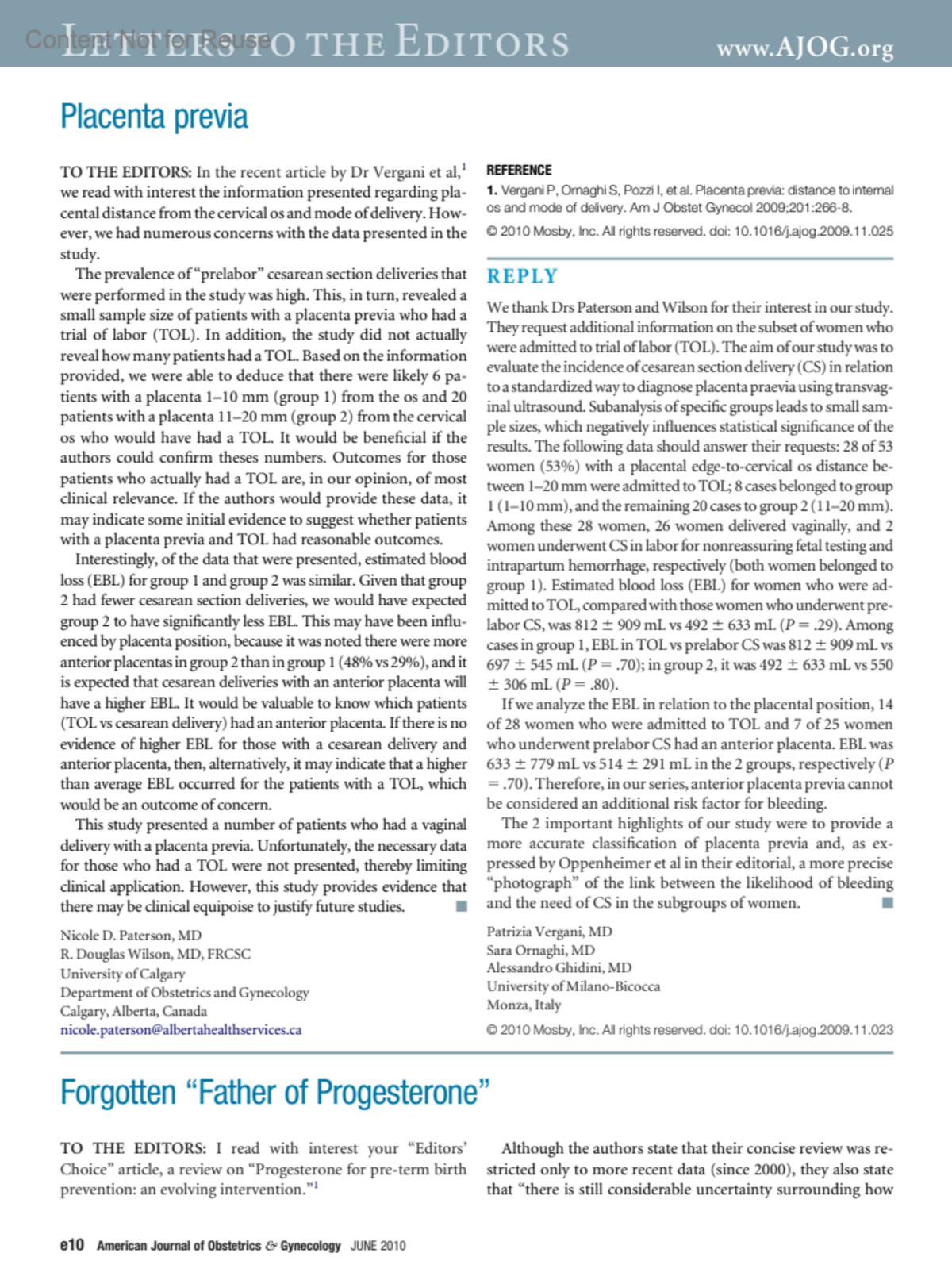 Placenta previaVergani, Patrizia MDOrnaghi, Sara MDGhidini, Alessandro MDAuthor informationUniversity of Milano-Bicocca, Monza, ItalyAmerican Journal of Obstetrics and Gynecology 202(6):p e10, June 2010.Copyright © Mosby-Year Book Inc. 2010. All Rights Reserved.