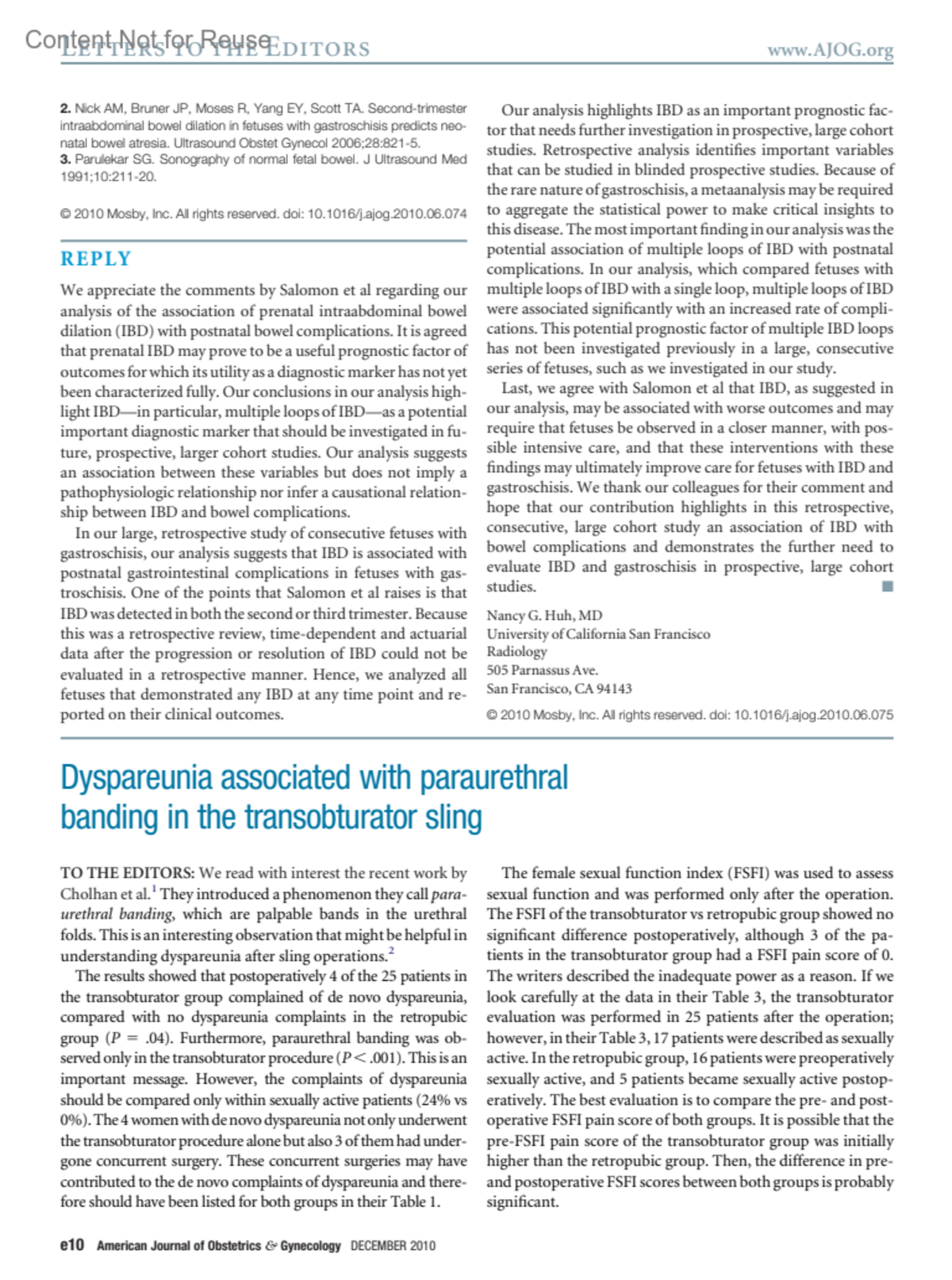The meaning of intraabdominal bowel dilation in fetuses with gastroschisisHuh, Nancy G. MDAuthor informationUniversity of California San Francisco, Radiology, 505 Parnassus Ave., San Francisco, CA 94143American Journal of Obstetrics and Gynecology 203(6):p e10, December 2010.Copyright © Mosby-Year Book Inc. 2010. All Rights Reserved.