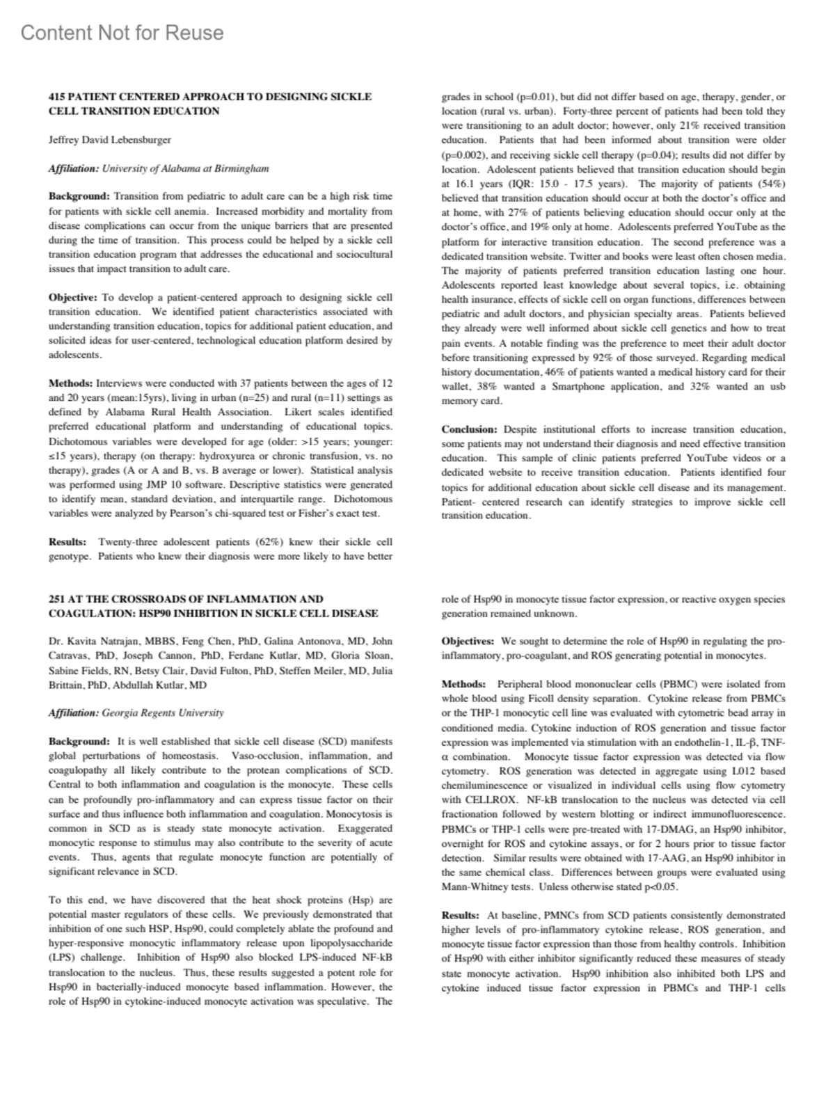 PATIENT CENTERED APPROACH TO DESIGNING SICKLE CELL TRANSITION EDUCATION415Lebensburger, Jeffrey DavidAuthor informationAffiliation:University of Alabama at BirminghamAmerican Journal Of Hematology 88(12):p e54, December 2013.Copyright © 2013 John Wiley & Sons, Ltd