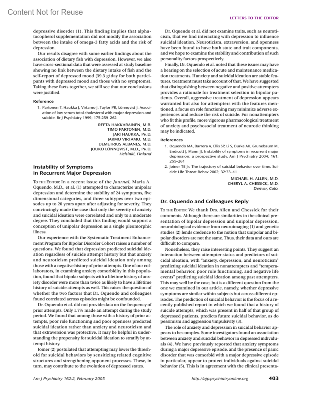 American Journal of Psychiatry 162(2):p 403-404, February 2005.