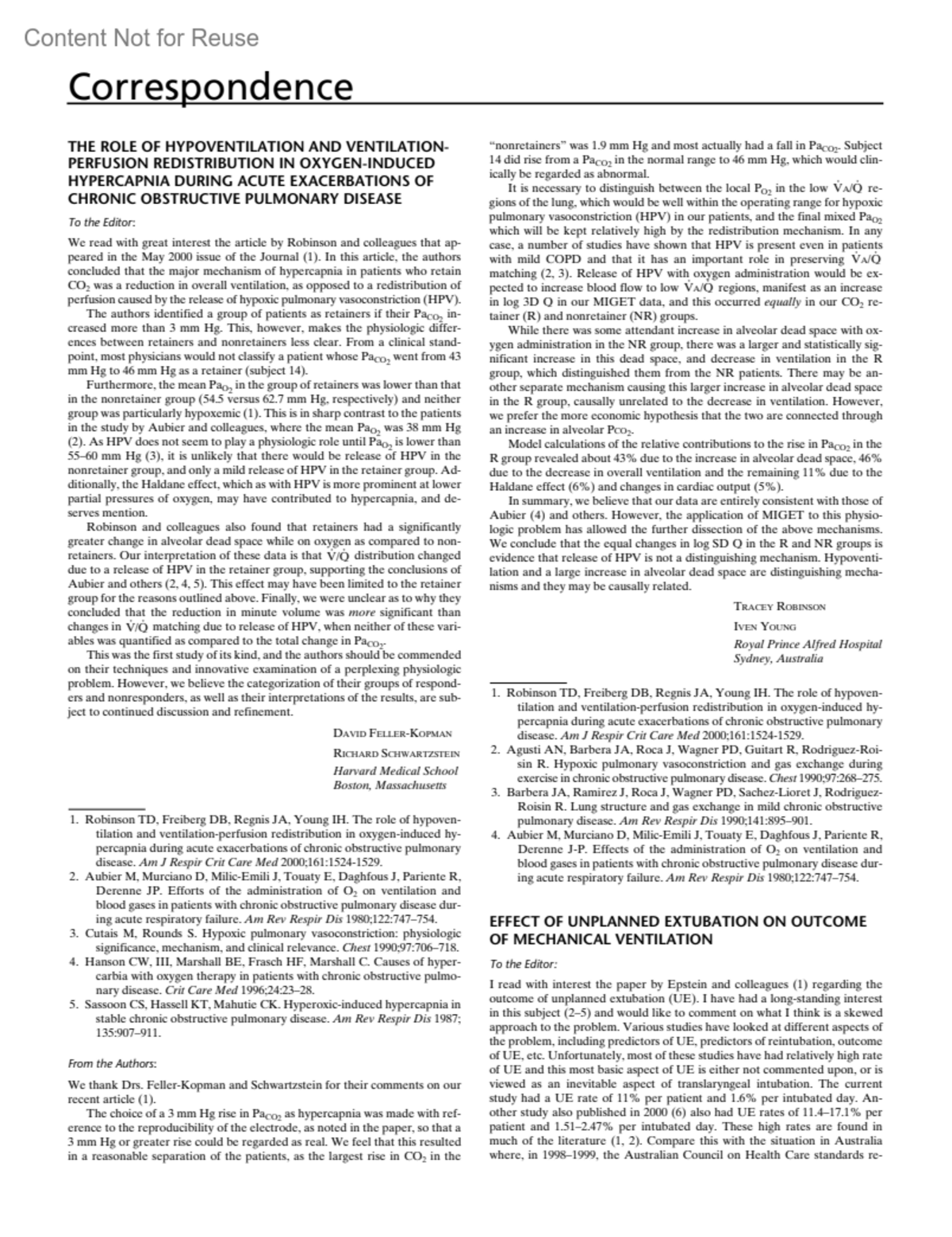 EFFECT OF UNPLANNED EXTUBATION ON OUTCOME OF MECHANICAL VENTILATIONEpstein, ScottAuthor informationTufts University School of Medicine, Boston, MassachusettsAmerican Journal of Respiratory and Critical Care Medicine 163(7):p 1755-1756, June 1, 2001.Copyright © 2001 American Thoracic Society
