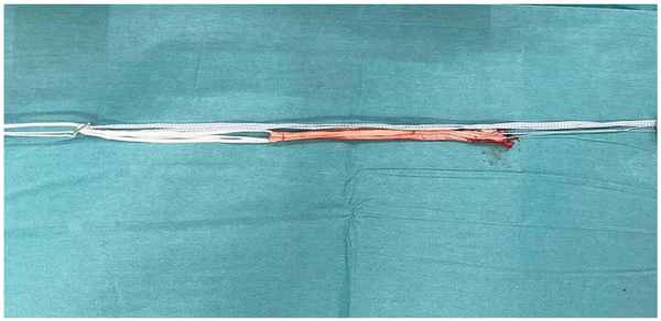 Clinical photograph showing a bone–patellar tendon–bone autograft construct augmented with suture tape.