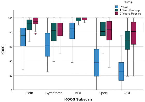 Clustered boxplot demonstrating improvement in KOOS domain scores over time. ADL, Activities of Daily Living; KOOS, Knee injury and Osteoarthritis Outcome Score; Post-op, postoperative; Pre-op, preoperative; QOL, Quality of Life; Sport, Sport and Recreation.
