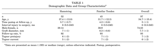 The autologous graft types included 52 hamstring and 45 patellar tendon grafts. The mean overall graft diameter was 7.7 (±1) mm. For hamstring grafts, the mean diameter of 7 (±1) mm (range, 6-9 mm) was lower than that of the patellar tendon, which was 8.3 (±0.6) mm (range, 7-9 mm) (P < .001). On average, the patellar tendon group was younger than the hamstring group (31.7 [±12.3] years vs 37.4 [±13.8] years; P = .04). Also, the patellar tendon group had a significantly higher Tegner activity level preinjury (7 [±1] vs 6 [±2]; P = .01).