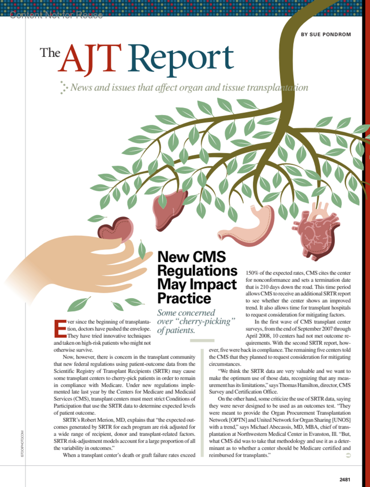 This month The AJT Report looks at how CMS regulations on transplantation outcome measures could affect which patients are selected to receive transplants, as well as new research that is re-igniting the debate over timing of death.