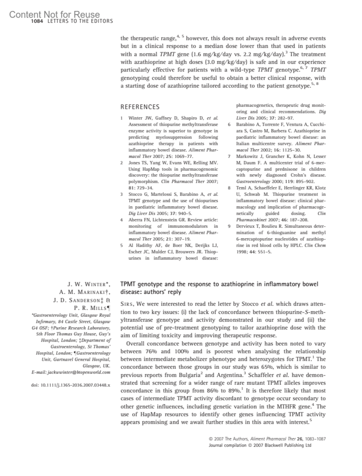Alimentary Pharmacology & Therapeutics 26(7):p 1084-1085, October 2007.