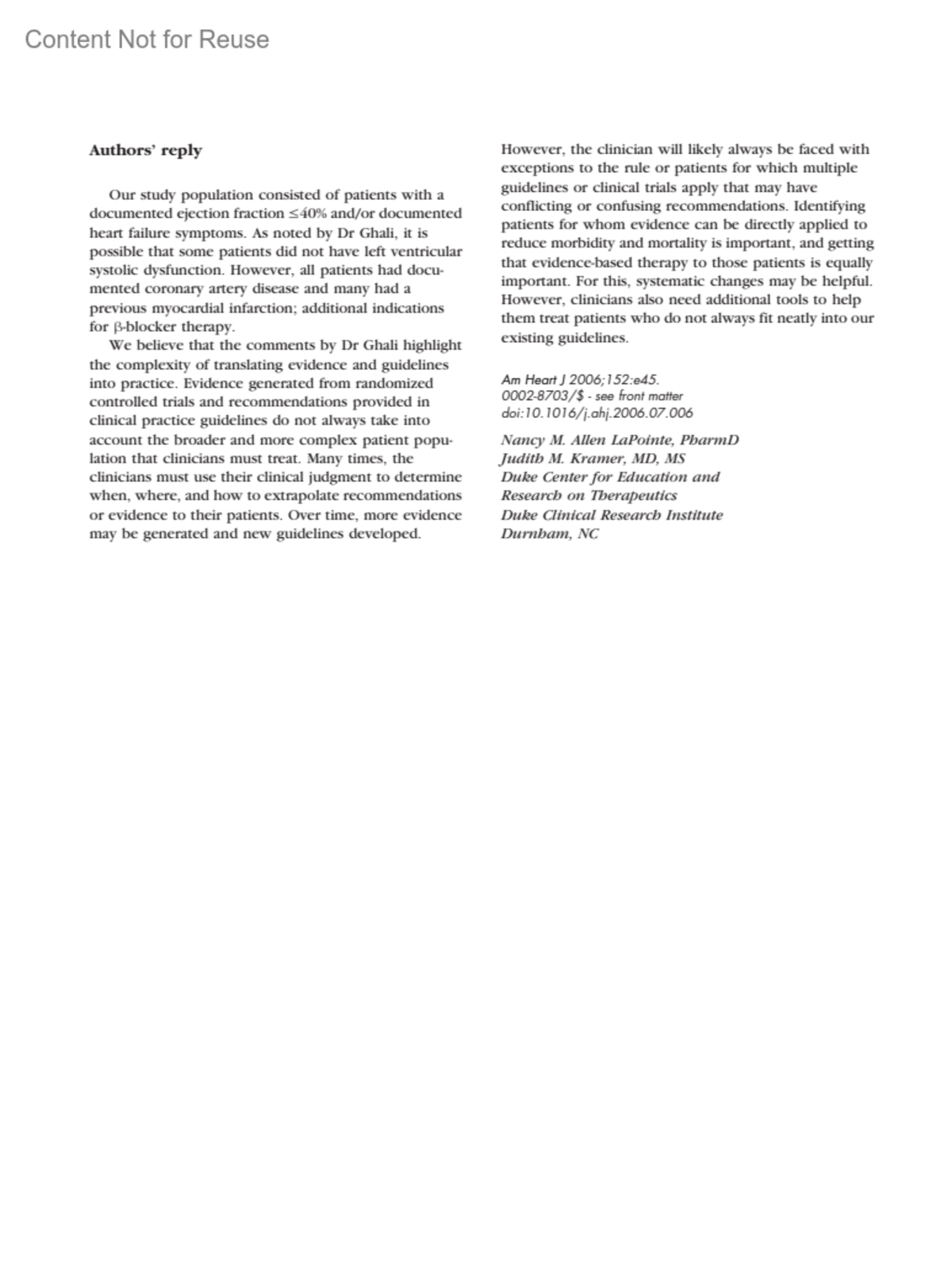 There is still hope for multifaceted intervention in heart failureLaPointe, Nancy M. Allen PharmDKramer, Judith M. MD, MSAuthor informationDuke Center for Education and Research on Therapeutics, Duke Clinical Research Institute Durnham, NCAmerican Heart Journal 152(4):p e45, October 2006.Copyright © Mosby-Year Book Inc. 2006. All Rights Reserved.