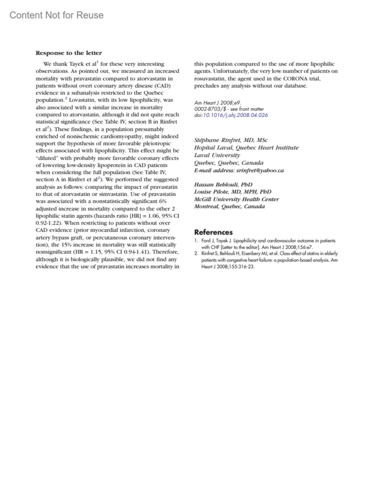 Lipophilicity and cardiovascular outcome in patients with CHFRinfret, Stéphane MD, MScBehlouli, Hassan PhDPilote, Louise MD, MPH, PhDAuthor informationaHopital Laval, Quebec Heart Institute Laval University Quebec, Quebec, Canada E-mail address:[email protected]bMcGill University Health Center Montreal, Quebec, CanadaAmerican Heart Journal 156(2):p e9, August 2008.Copyright © Mosby-Year Book Inc. 2008. All Rights Reserved.