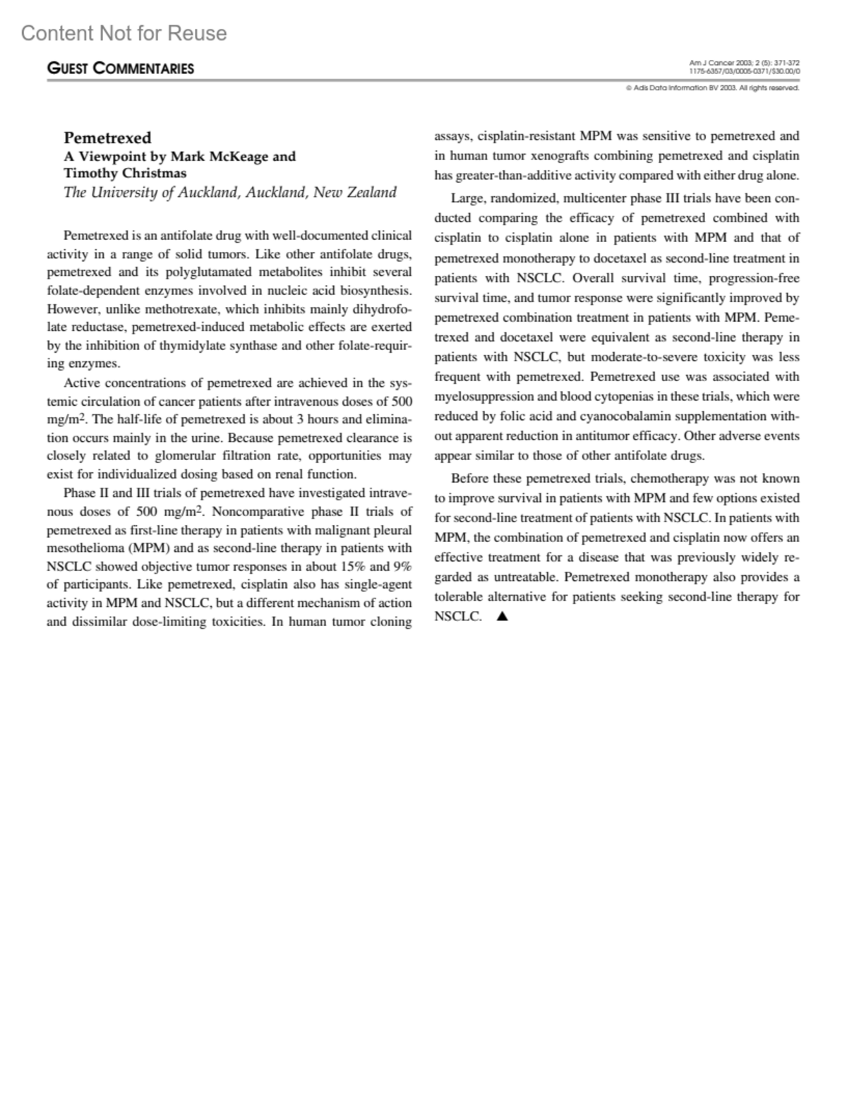 PemetrexedA Viewpoint by Mark McKeage and Timothy ChristmasMcKeage, MarkChristmas, TimothyAmerican Journal of Cancer 2(5):p 371-372, 2003.Copyright © 2003 Adis International