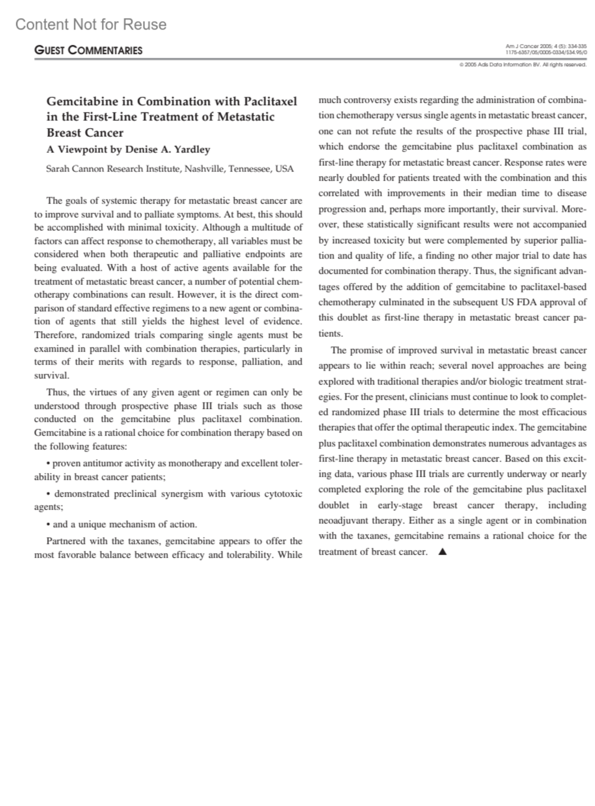 Gemcitabine in Combination with Paclitaxel in the First-Line Treatment of Metastatic Breast CancerA Viewpoint by Denise A. YardleyYardley, Denise AAuthor informationSarah Cannon Research Institute, Nashville, Tennessee, USAAmerican Journal of Cancer 4(5):p 334-335, 2005.Copyright © 2005 Adis Data Information BV