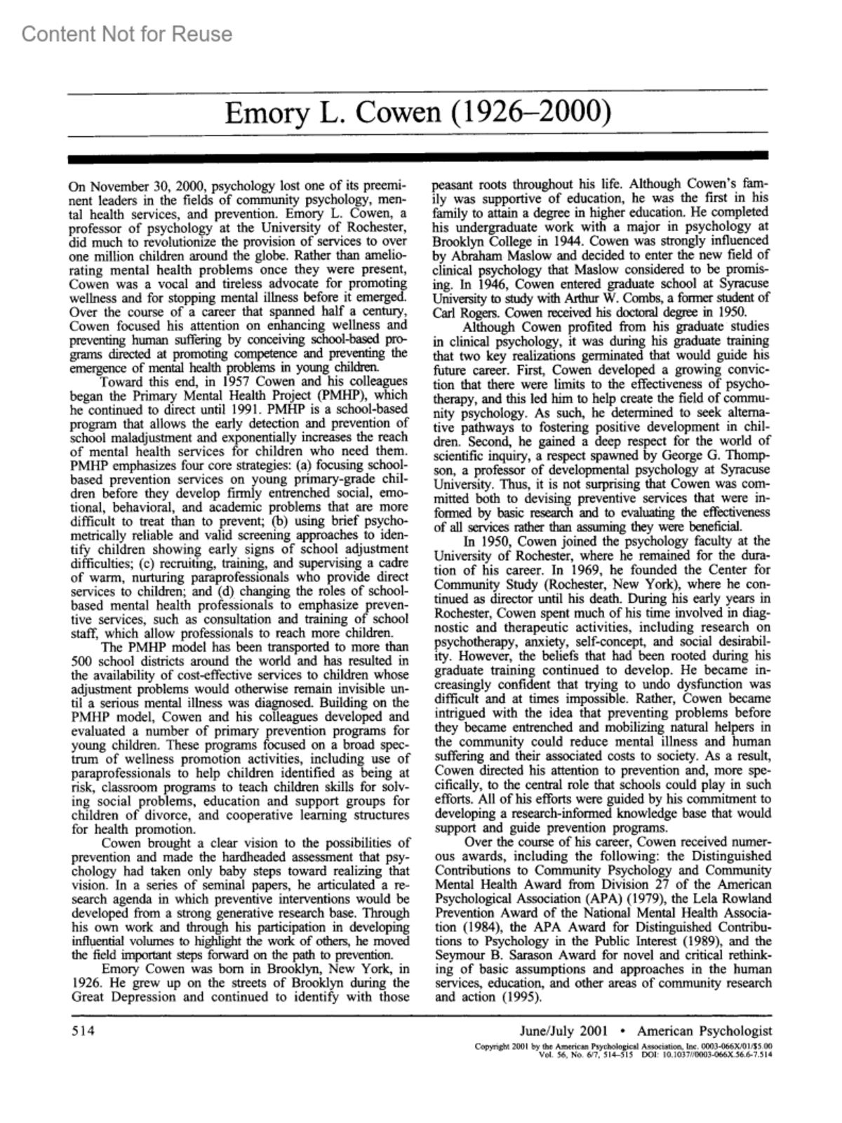 Emory L. Cowen (1926–2000)Cicchetti, DanteRappaport, JulianSandler, IrwinWeissberg, Roger P.Author information1University of Rochester2University of Illinois at Urbana–Champaign3Arizona State University4University of Illinois at Chicago.American Psychologist 56(6/7):p 514-515, June/July 2001.Copyright © 2001 by the American Psychological Association