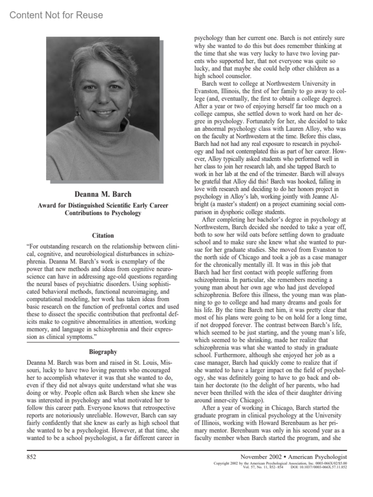 Award for Distinguished Scientific Early Career Contributions to PsychologyBarch, Deanna M.American Psychologist 57(11):p 852-854, November 2002.Copyright © 2002 by the American Psychological Association