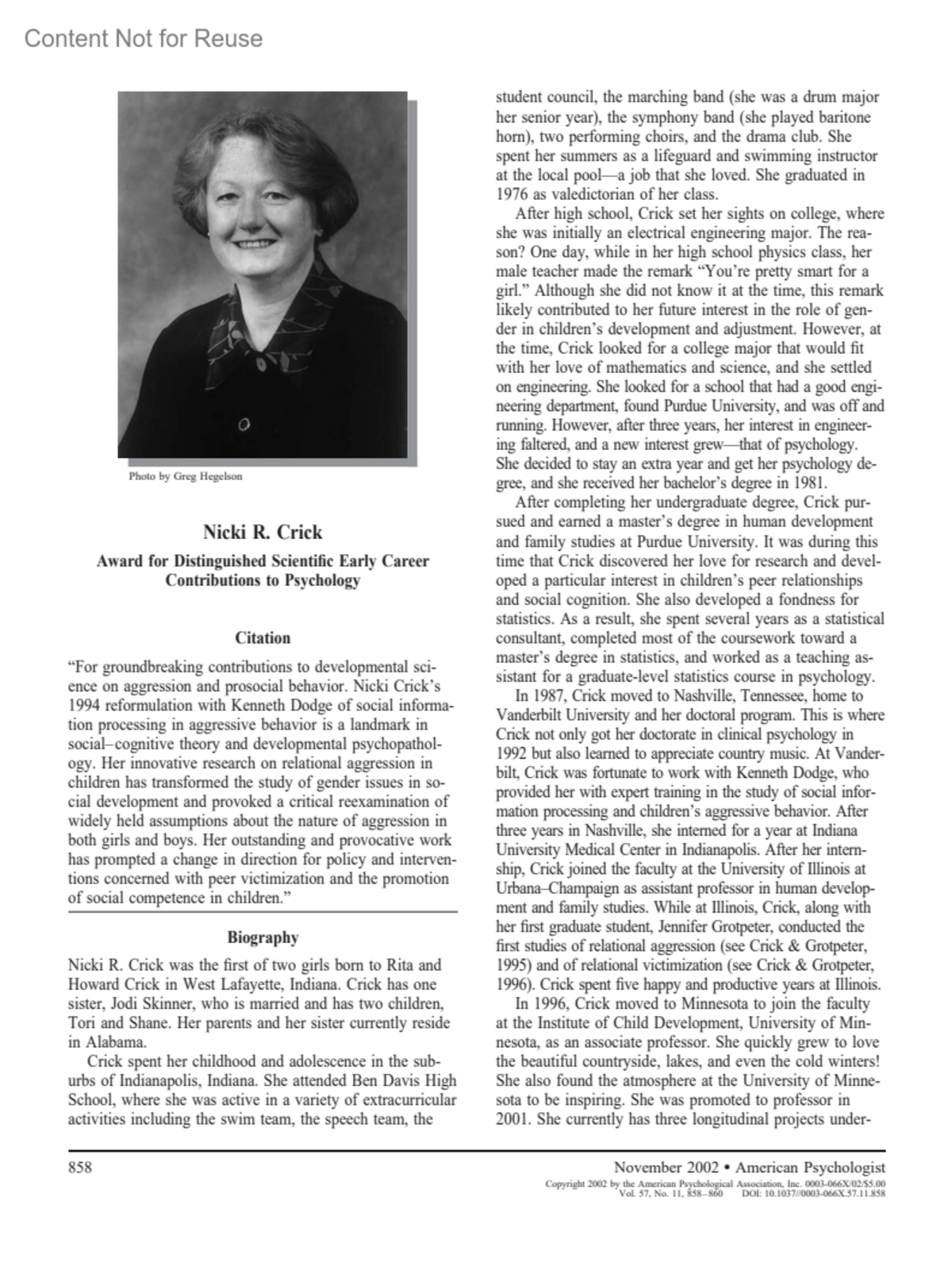 Award for Distinguished Scientific Early Career Contributions to PsychologyCrick, Nicki R.American Psychologist 57(11):p 858-860, November 2002.Copyright © 2002 by the American Psychological Association
