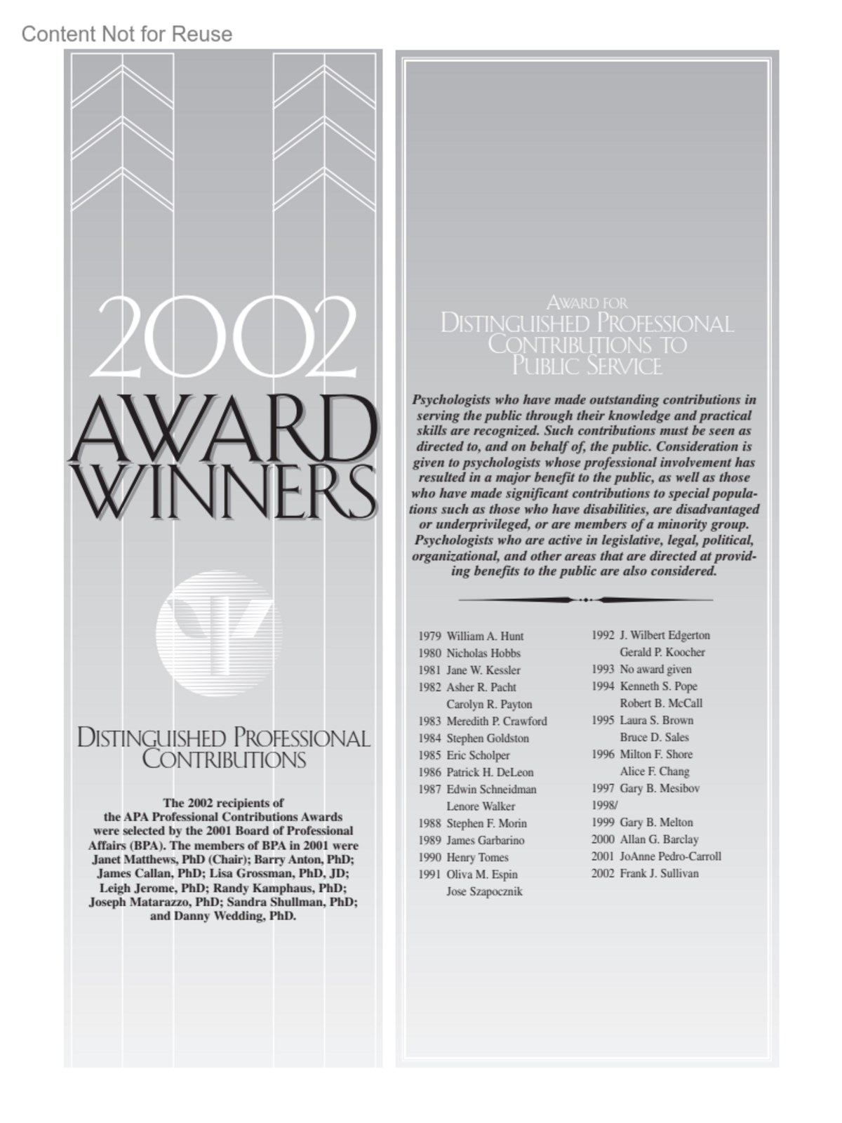 Award for Distinguished Professional Contributions to Public ServiceSullivan, Frank J.American Psychologist 57(11):p 942-943, November 2002.Copyright © 2002 by the American Psychological Association
