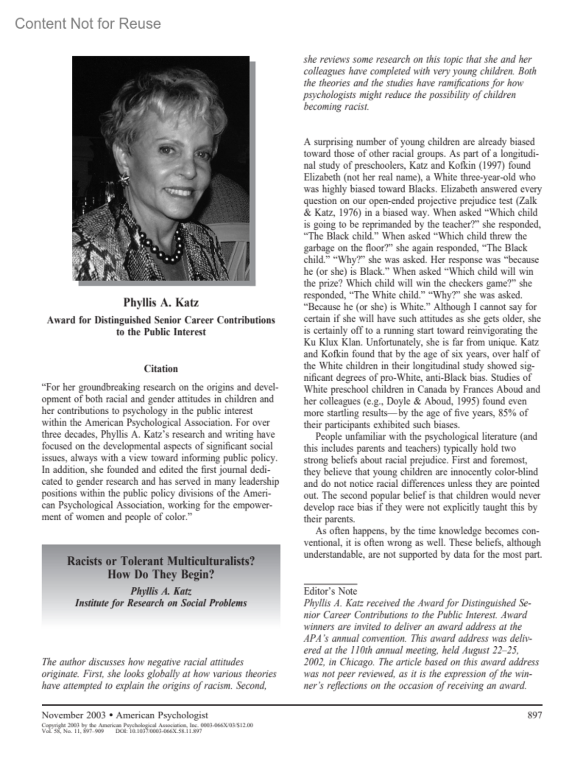 Phyllis A. KatzAwards for Distinguished Senior Career Contributions to the Public InterestKatz, Phyllis A.American Psychologist 58(11):p 897, November 2003.Copyright © 2003 by the American Psychological Association
