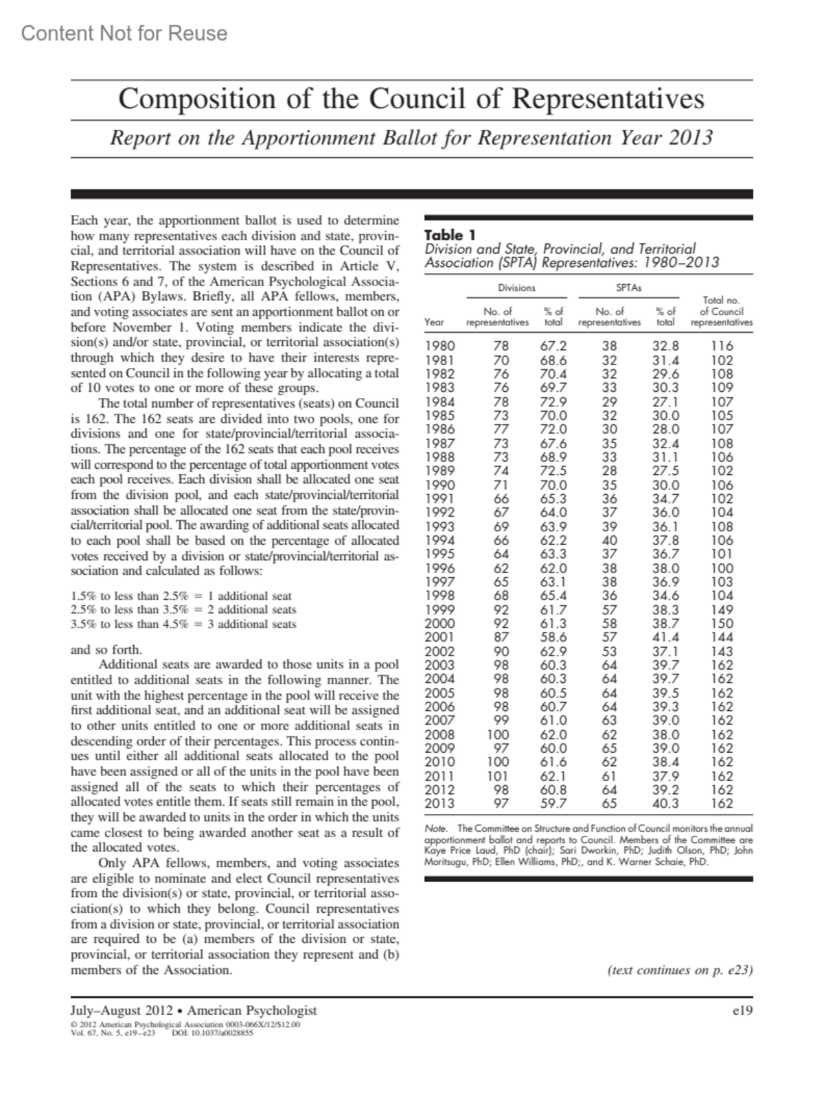 Composition of the Council of RepresentativesReport on the Apportionment Ballot for Representation Year 2013American Psychologist 67(5):p e19, July-august 2012. | DOI: 10.1037/a0028855Copyright © 2012 by the American Psychological Association