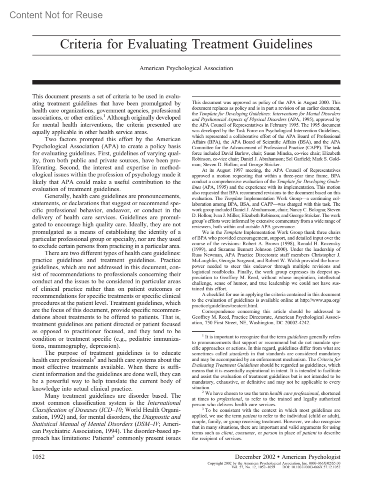 A checklist for use in applying the criteria contained in this document to the evaluation of guidelines is available online at http://www.apa.org/practice/guidelines/treatcrit.html.