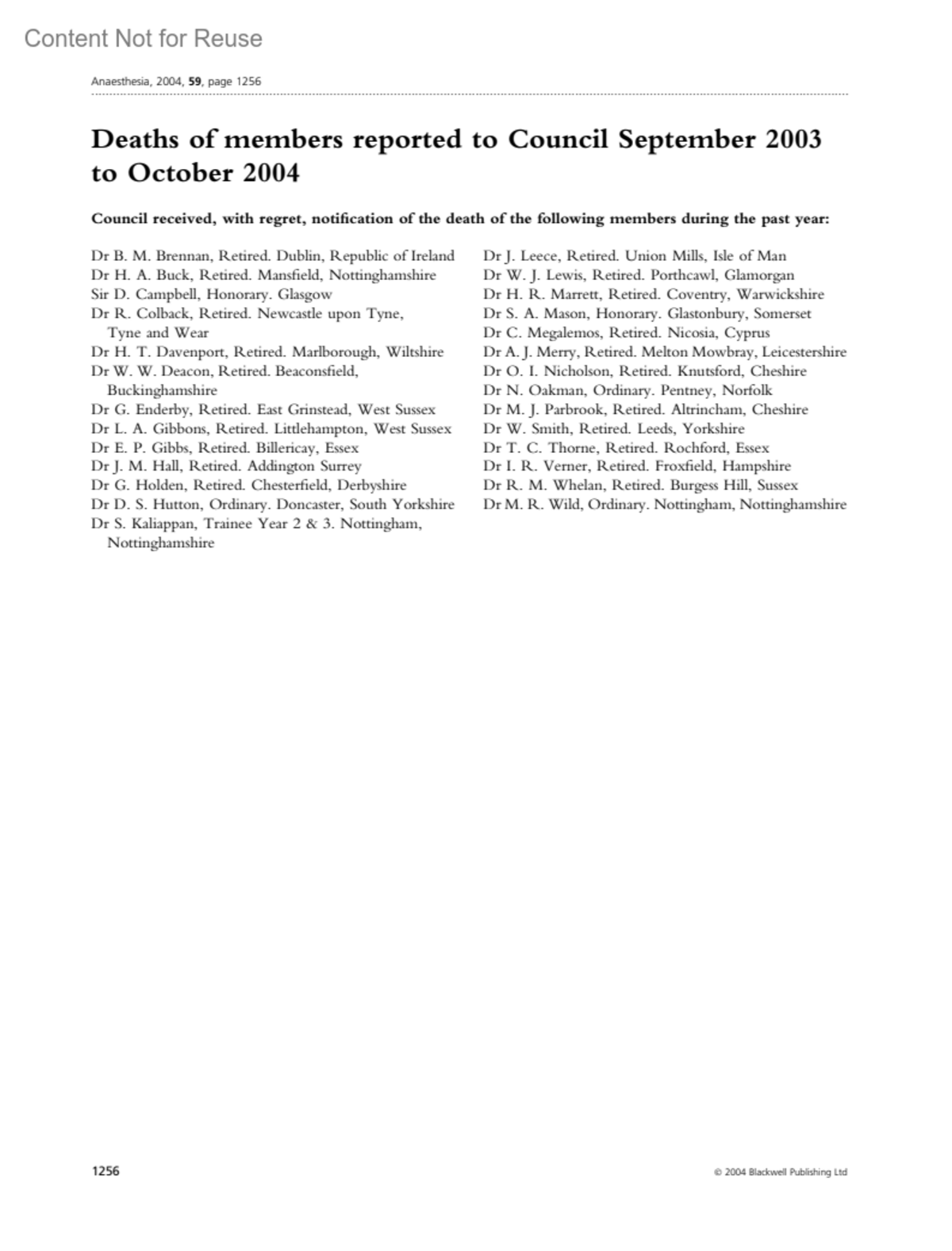 Deaths of members reported to Council September 2003 to October 2004Anaesthesia 59(12):p 1256, December 2004.Copyright © 2004 Association of Anaesthetists of Great Britain & Ireland