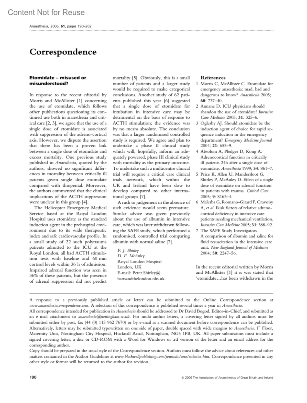 Correspondence to: A response to a previously published article or letter can be submitted to the Online section at http://www.anaesthesiacorrespondence.com. A selection of this correspondence is published several times a year in Anaesthesia. All correspondence intended for publication in Anaesthesia should be addressed to Dr David Bogod, Editor-in-Chief, and submitted as an e-mail attachment to [email protected]. For multi-author letters, a covering letter signed by all authors must be submitted either by post, fax (44 (0) 115 962 7670) or by e-mail as a scanned document before correspondence can be published. Alternatively, letters may be submitted typewritten on one side of paper, double spaced with wide margins to Anaesthesia, 1st Floor, Maternity Unit, Nottingham City Hospital, Hucknall Road, Nottingham, NG5 1PB, UK. All paper submissions must include a signed covering letter, a disc or CD-ROM with a Word for Windows or.rtf version of the letter and an email address for the corresponding author. Copy should be prepared in the usual style of the section. Authors must follow the advice about references and other matters contained in the Author Guidelines at http://www.blackwellpublishing.com/journals/ana/submiss.htm. presented in any other style or format will be returned to the author for revision.