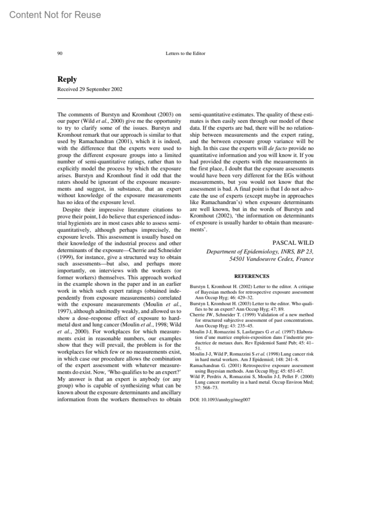 Who Qualifies to be an Expert?Wild, PascalAuthor informationDepartment of Epidemiology, INRS, BP 23, 54501 Vandoeuvre Cedex, FranceReceived 29 September 2002Annals of Occupational Hygiene 47(1):p 90, January 2003.Copyright © Copyright Oxford University Press 2003.