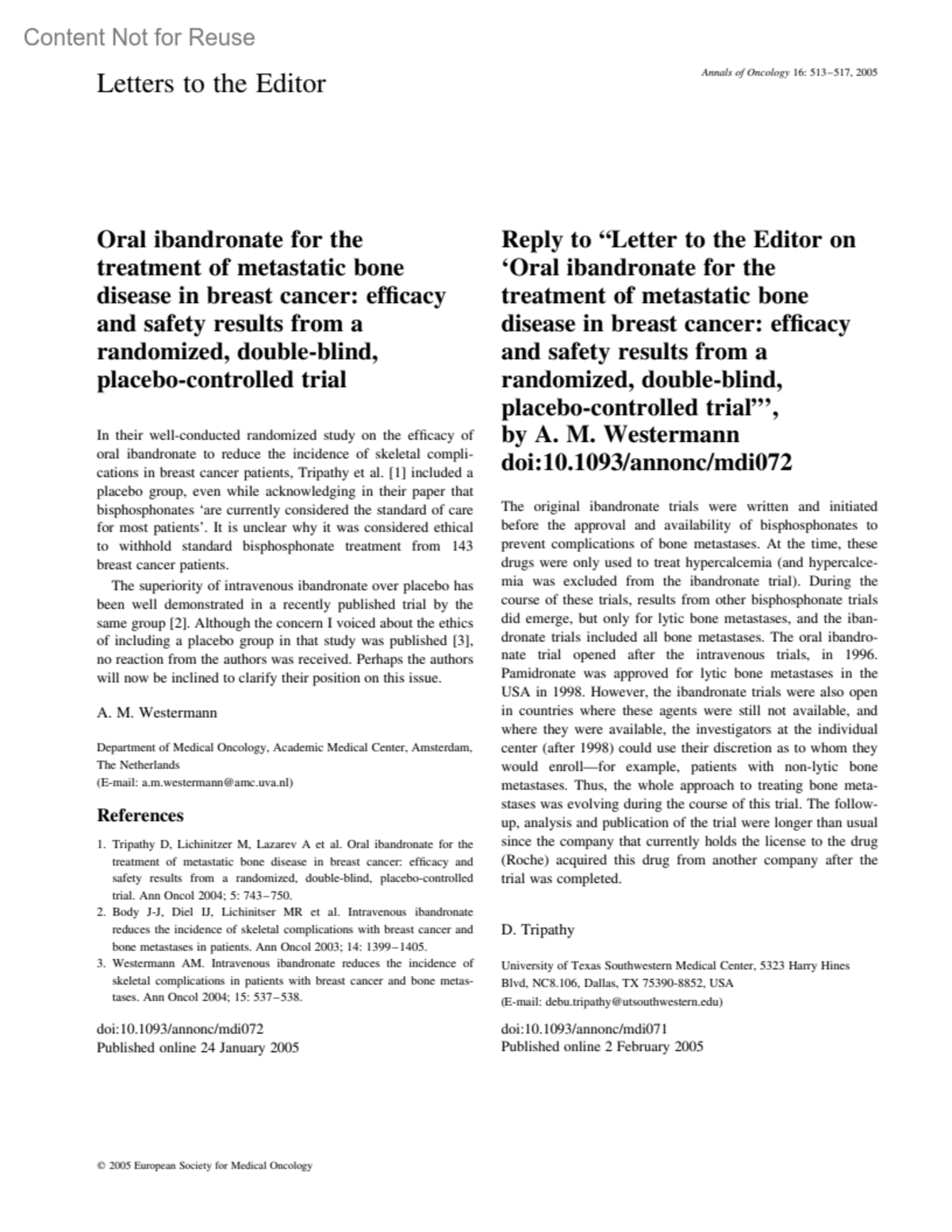 Oral ibandronate for the treatment of metastatic bone disease in breast cancer: efficacy and safety results from a randomized, double-blind, placebo-controlled trial