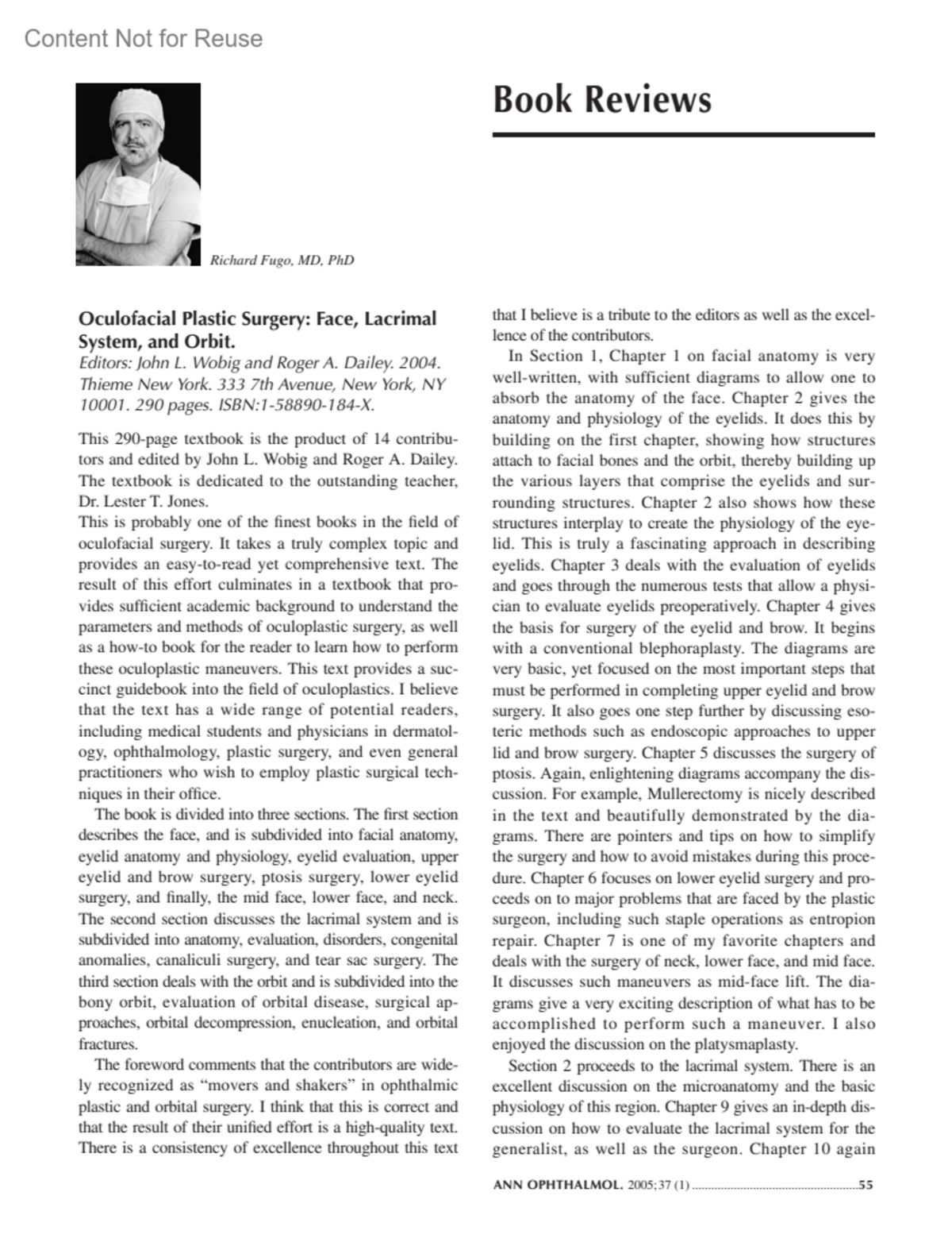 Oculofacial Plastic SurgeryFace, Lacrimal System, and OrbitFugo, Richard J. MD, PhDAuthor informationFugo Eye Institute, Norristown, PAAnnals of Ophthalmology 37(1):p 55-56, Spring 2005.Copyright © 2005 by ASCO