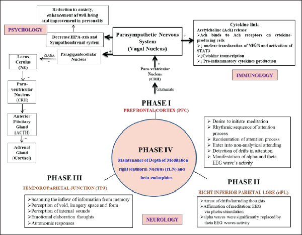 In today’s era, many meditation techniques are being practiced but the authors have focused specifically on “preksha meditation” (PM) because of the enhancing properties of attention skills and how these attention skills exert their psychoneuroimmunological effects on understanding the specific physiological pathways that warrant specific treatment interventions. Based on the previous literatures,, , , , the present evidence-based mechanism of long-term meditation practice is designed to highlight how three components of induction of meditation include efferent attenuation, afferent attenuation, and targeted nonanalytical thinking help in regulating the psychoneuroimmunological effects of depth of meditation., , , These three components represent three Meditative Phases operating in a cyclic pattern within the different brain structures involved in the active preksha meditation process. The PFC plays a vital role in initiating the meditative processes by helping to detect and avoid wandering thoughts (Phase I, Figure 1). This Phase I has a role in a decision-making phase and is revealed by the appearance of both alpha and theta EEG wave’s activity was significantly and consistently higher for experienced meditators, probably reflecting relaxation, awareness, conscious state, and affective processing., Phase II helps to arrest intruding thoughts; for this, the meditator is encouraged to enhance the capability to focus attention on a focussed target. To detect thought wandering various neurophysiological techniques have been involved that including EEG with photic stimulation,, , button press system, and many more., Scientifically, EEG recording with photic stimulation was found to be an appropriate marker to detect the drift-in attention,, , , especially in studying the human brain during neuroimaging with a novel methodology. Further, in Phase II i.e., sensory attenuation, alpha EEG waves were significantly substituted by theta EEG waves, proportionately with the depth of the meditation., , , At last, Phase III plays an important role which involves the temporal lobe plays an important role in emotional elaboration and conception of peculiar memory patterns often reported by meditators. The Phase III state is equivalent to samadhi where alpha EEG waves were consistently higher and there was a “shut down” inappropriate network for the maintenance of internalized focused attention., , , , , and this same was affirmed in the author’s previous study by giving photic stimulation. Hence, all three Meditative Phases may operate in a cyclic pattern and this pattern goes on repeatedly till the meditation process continue. Further, to maintain the cyclic pattern (Phase IV) between all the phases of meditation, it is very important to perceive the inner positive feelings-like experiences that help in the regulation of emotions and the attention process. Further, PFC simultaneously gives excitatory inputs to the arcuate nucleus of the hypothalamus to release β-endorphin, along with subcortical structures including right caudate nucleus (rCN) concerned with emotional and focused attention regulation and right lentiform nucleus (rLN) of basal ganglia, involved in the reward-like experience. Previous studies have also shown an increased level of β-endorphin during various relaxation techniques including meditation and exercise., , ,