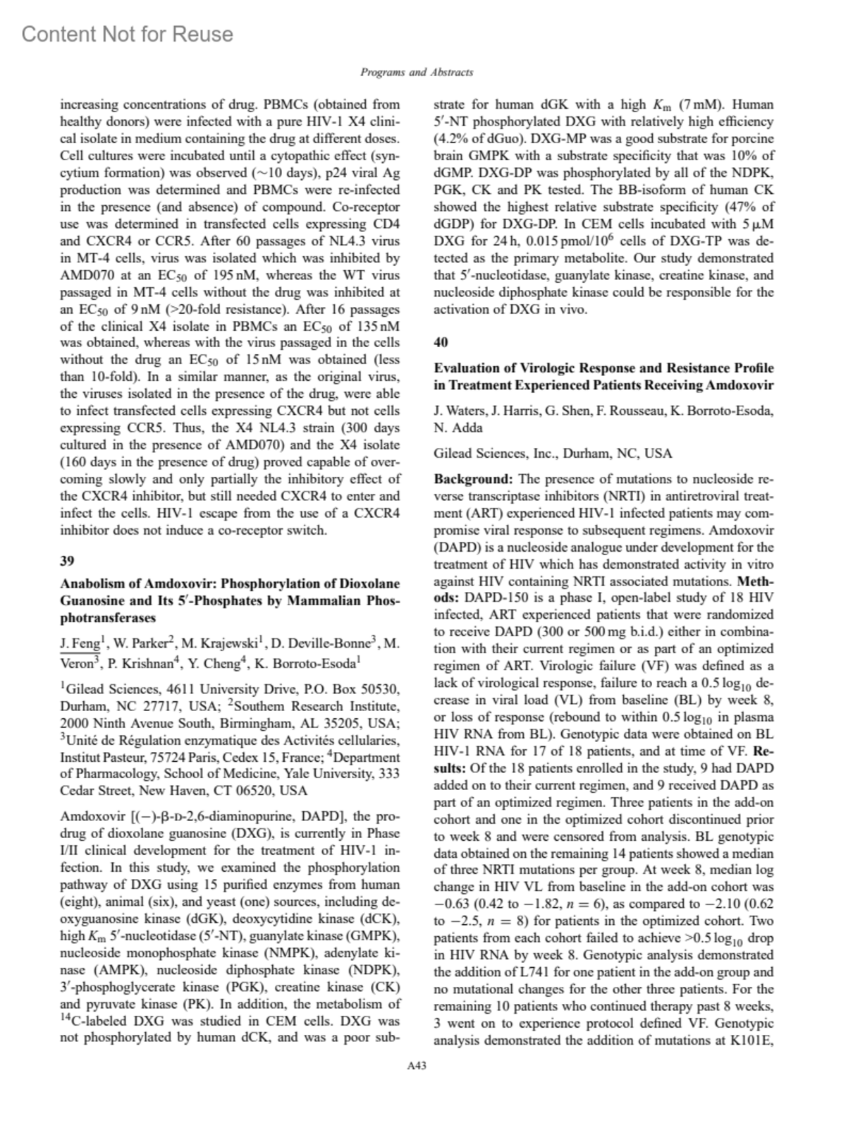 1Gilead Sciences, 4611 University Drive, P.O. Box 50530, Durham, NC 27717, USA; 2Southem Research Institute, 2000 Ninth Avenue South, Birmingham, AL 35205, USA;3Unité de Régulation enzymatique des Activités cellularies, Institut Pasteur, 75724 Paris, Cedex 15, France; 4Department of Pharmacology, School of Medicine, Yale University, 333 Cedar Street, New Haven, CT 06520, USA