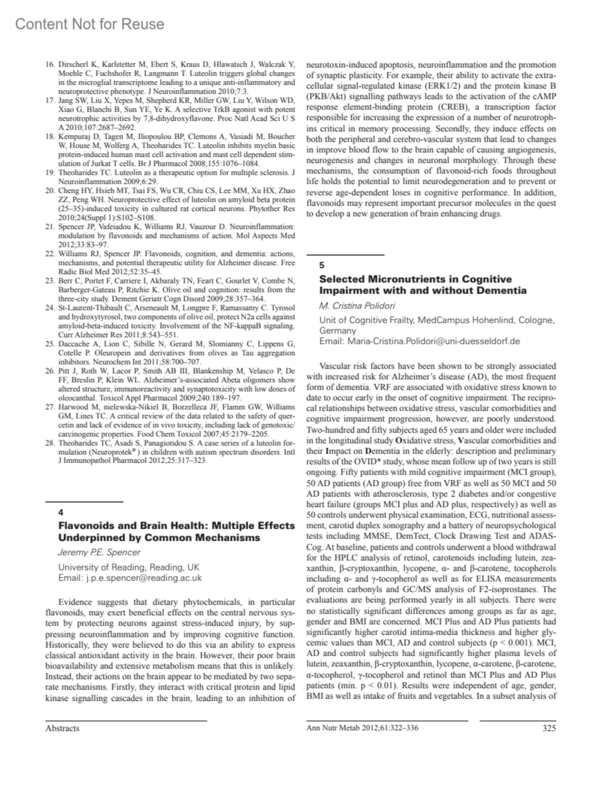 Flavonoids and Brain Health: Multiple Effects Underpinned by Common Mechanisms4Spencer, Jeremy P.E.Author informationUniversity of Reading, Reading, UK Email: [email protected]Annals of Nutrition & Metabolism 61(4):p 325, December 2012.Copyright © 2012 S. Karger AG, Basel