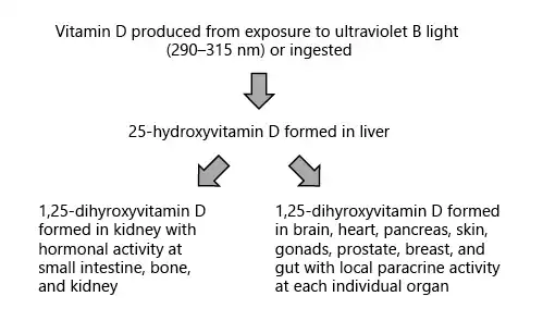 Additionally, in the early 21st century, there were reports of vitamin D’s potential role in disease processes not related to calcium homeostasis and bone health. Many organs have 25(OH)D receptors which bind 25(OH)D. Instead of relying on the renal production of 1,25-dihydroxyvitamin D (1,25[OH]2D) from 25(OH)D, these organs form 1,25(OH)2D locally in a paracrine fashion (Fig. 1). Therefore, these organs depend on the availability of vitamin D and its transformation to 25(OH)D by the liver to provide circulating 25(OH)D. Disease processes in adults found to have an association with vitamin D status include cancer, specifically breast, colon, and prostate; heart disease; autoimmune disease, specifically diabetes, rheumatoid arthritis, and systemic lupus erythematosus; infectious disease, specifically influenza and tuberculosis; and allergic disease []. Not all associations have been substantiated by further investigation such as trials of vitamin D supplementation. However, they have led to exploration of similar associations in children and adolescents, which thereby are considerations in vitamin D supplementation to these age groups.