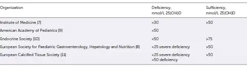 In the early 21st century, several investigators challenged this existing definition of normal when they performed studies to identify the vitamin D status required to optimize intestinal calcium absorption, to appropriately lower parathyroid hormone (PTH) concentration, and to optimize bone mineralization [-]. In these studies of vitamin D function in the adult population, results pointed to 75–100 nmol/L as the lower limit of vitamin D sufficiency for adult calcium homeostasis and bone health. These studies and others led to new public health recommendations that include not only a definition of vitamin D deficiency but also a definition of vitamin D sufficiency (Table 1) [-]. In 2008, the AAP reevaluated its 2003 statement and chose to increase to a recommendation of at least 400 IU/day for all infants, children, and adolescents [].