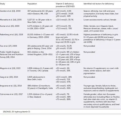 Studies vary in reports of vitamin D deficiency and insufficiency worldwide. A snapshot of large population studies is provided in Table 2 to demonstrate the trends through the years, differences and similarities between countries, and variation between age groups. Studies performed in Asia demonstrate a higher prevalence of vitamin D deficiency compared to those in Europe, North America, and New Zealand [-]. However, one Western population observed to have a higher prevalence are adolescents in the Public Health England database where 20% of boys 11–18 years old and 24% of girls 11–18 years old demonstrated a 25(OH)D level <25 nmol/L []. In fact, though infants are at risk for disease such as vitamin D-associated rickets worldwide, many population studies in higher-resource countries demonstrate lower vitamin D status in adolescents compared to toddlers [, , ], while studies in lower-resource countries show the expected higher vitamin D deficiency prevalence for infants/toddlers especially when breastfeeding []. Dark skin color, measured by race, ethnicity, or skin pigmentation, is a risk factor for deficient vitamin D [, , , ]. In countries where milk and/or juice are fortified with vitamin D, lower or no intake of these products is associated with higher risk for deficiency, which supports fortification as a method to improve child vitamin D status [, , ].