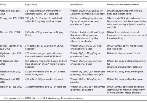 - 38. Viljakainen HT, Natri AM, Kärkkäinen M, Huttunen MM, Palssa A, Jakobsen J, et al A positive dose-response effect of vitamin D supplementation on site-specific bone mineral augmentation in adolescent girls: a double-blinded randomized placebo-controlled 1-year intervention. J Bone Miner Res. 2006;21(6):836–44.