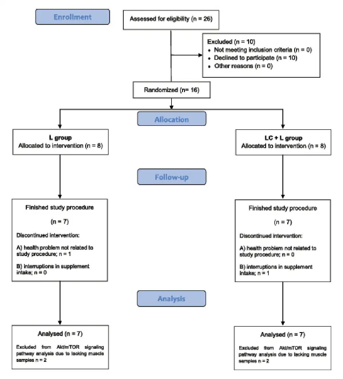 The participants were randomly assigned (1:1 ratio) to one of the two supplemented groups using the Random Sequence Generator (RANDOM.ORG, Dublin, Ireland). The supplements were encapsulated in identical gelatin capsules, so that neither the investigators nor the participants were aware of their contents. The participants were instructed to consume the supplements once a day with their main meal. Over the 24 weeks, the participants’ diets were supplemented with either 1 g of LC-L-tartrate and 3 g of leucine per day (LC + L group) or 4 g of leucine per day (L group) as a placebo.