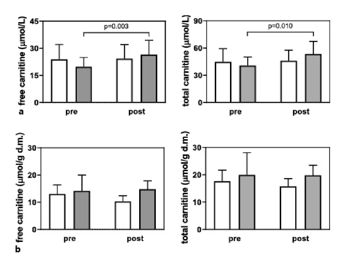 Plasma (a) and muscle (b) free and total carnitine concentrations in the L group (white bars), and LC + L group (gray bars) before and after 24 weeks of supplementation. Values are presented as means (±SD).