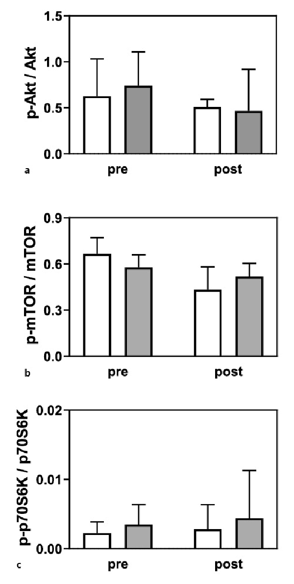 Serum IGF-1 concentrations did not differ during the study in both groups (LC + L group, pre 156 ± 26 vs. post 152 ± 31 µg/L; L group, pre 178 ± 37 vs. post 168 ± 34 µg/L), and no interaction group per time was noted (p = 0.640). Moreover, no changes were observed in the phosphorylation of the signaling pathway proteins Akt, mTOR, and p70S6K (Fig. 3a–c).