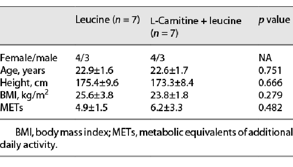 Circulating carnitine levels increase after 2 weeks of LC supplementation [], but for an increase in the skeletal muscle TC content, LC should be consumed for at least 100 days []. In addition, the muscle carnitine levels increase only when LC is co-ingested with a large amount of CHO to induce an insulin response []. To improve the transport of LC into muscles, we used 24 weeks of LC supplementation in combination with leucine, because of its insulin secretagogue effect []. However, the increase in insulin levels in our study may be rather low compared with those in previous LC supplementation studies using CHO-mediated insulin release []. This may be a reason why we did not observe any changes in the skeletal muscle TC content.