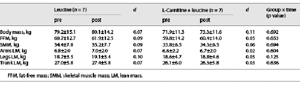 The main findings of this study were that 24 weeks of LC and leucine supplementation increased the plasma FC and TC concentrations but did not change the skeletal muscle carnitine content. In addition, no differences were noted in the SMM and signaling pathway activity. Nevertheless, some moderate effects were observed on muscle function.